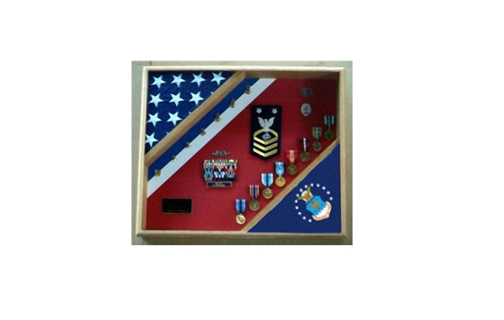 The Air Force Flags and medal display frame designed to resemble the blue, white and red stripe of a Air Force along with the boat flag added showing the USAF shield