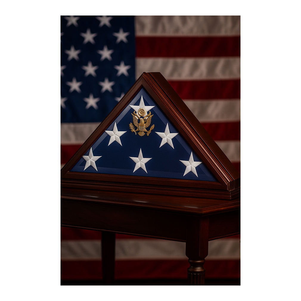 The hand rubbed walnut finish, beveled glass front, and great seal of the United States completes the look of this Burial flag case which creates a proper memorial for your loved one’s tribute of their military service.