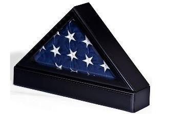 Military flag display cases, like a display for a national ensign, are ideal for a memorial presentation. These wooden military flag boxes protect a banner from dust and dirt, yet allow the keepsake gift to be viewed. These American flag cases have a triangular shape, so a national ensign folded in the standard fashion fits perfectly in the holder. The included pedestal adds height to the box and makes the display more visible when placed on a shelf. The American flag cases, also known as military shadow boxes, hold standard 3x5 flags. Custom made shadow boxes are unnecessary since a national ensign will fit perfectly within this unit. These shadow box displays, American flag cases can hang on walls or be placed on a mantel. The frame can lift off the base freely, allowing for a quick relocation of the display. These American flag cases that open from the back setup quick and easy. Simply turn the (4) plastic tabs and the backing pulls right off. A banner can then be placed inside, no special equipment needed.