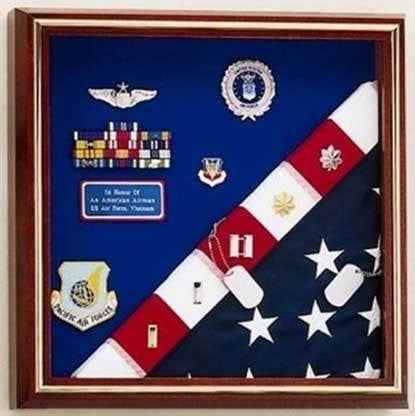 The flag and medal display case is constructed from choice Appalachian Hardwood with an elegant Queen Anne Cherry finish, gold accent trim, sturdy Masonite backing, and 1/8" glass front. A silk-screened, paper, flag front is included for display. The depth between the glass and Masoniteis 2 3/8".