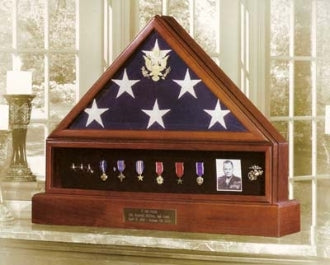 The Presidential Pedestal Urn Flag & Medal Display Case is a beautiful in a Walnut or Cherry finish and is crafted in the USA. The features an embossed Great Seal of the United States on the beveled glass front. The hinged lid contains a hidden magnetic closure that will keep your flag dust free.