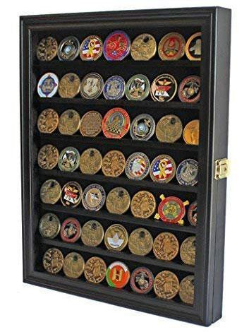 "This military challenge coin display case exceeded my expectations! It holds my Air Force, Navy, and Army challenge coins beautifully. The glass-front door keeps my collection safe and clean. The wood finish gives it a classy look. Fantastic product!"
