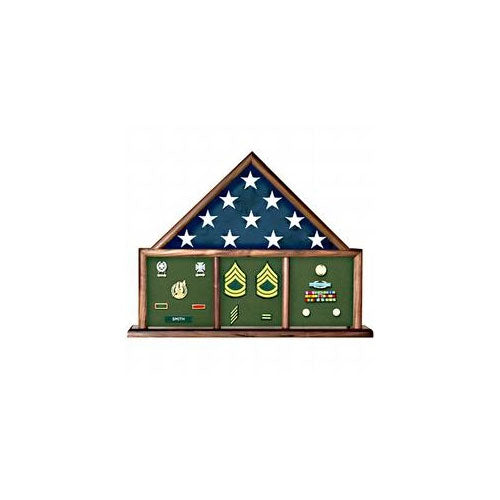 The back has easily removable fasteners that allow for convenient placement of your standard 3 ft. x 5 ft. flag. This solid wood case has three bays for medals or rank insignia. The middle bay has an optional forward position for a plaque, or the three bays may be on an equal plane for larger objects.