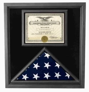 In this instance, our Flag and Certificate Case is specially designed to proudly display either a folded 3 X 5 American flag or a 5 X 9.5 American flag (burial flag). It also has room to prominently display an 8.5 X 11 certificate. Often times, when a flag is presented to honor a veteran, a certificate of authenticity is given. Our flag case is designed to make that certificate feature as prominently as the flag. The case also has room enough to include medals in your display, if you so desire.