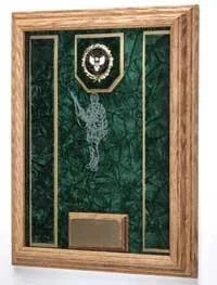 All of our Awards Display Cases are constructed of either Solid Oak or Solid Walnut. Raised mounting surfaces are available and may be selected for each of these cases. These will accept up to 8 full size medals. Without the raised surfaces you have additional freedom to do your own free style layout. In either case, all of the medals, ribbons, rank pins, crests, patches and special photo(s) will rest on luxurious Crushed Velvet. This display case is available in Velvet Colors appropriate for all branches of service, law enforcement agencies, firefighters, EMS personnel, athletes, and fraternal orders.