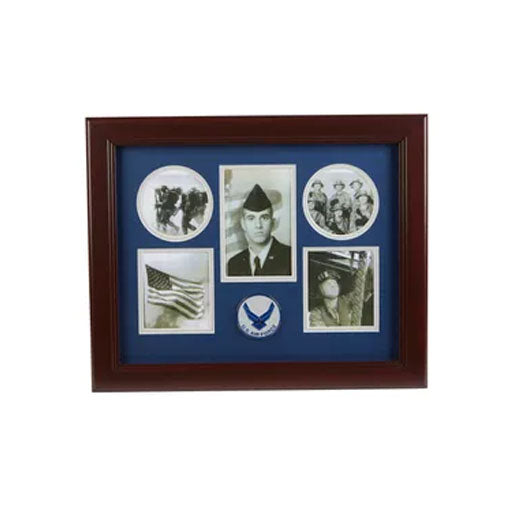U.S. Flag Store's Aim High Air Force Medallion Collage Frame is designed to hold 5 pictures: one 3-Inch by 5-Inch picture, two circular 3-Inch pictures and two 3.5-Inch by 3.5-Inch pictures. These pictures are set into a double layer of Blue matting with Grey trim. The frame is made from Mahogany colored wood, and the outside dimensions measure 13-Inches by 16-Inches. The Aim High Air Force Medallion 5 Picture Collage Frame is perfect for proudly displaying the pictures of an individual who is serving, or has served in the U.S. Air Force.