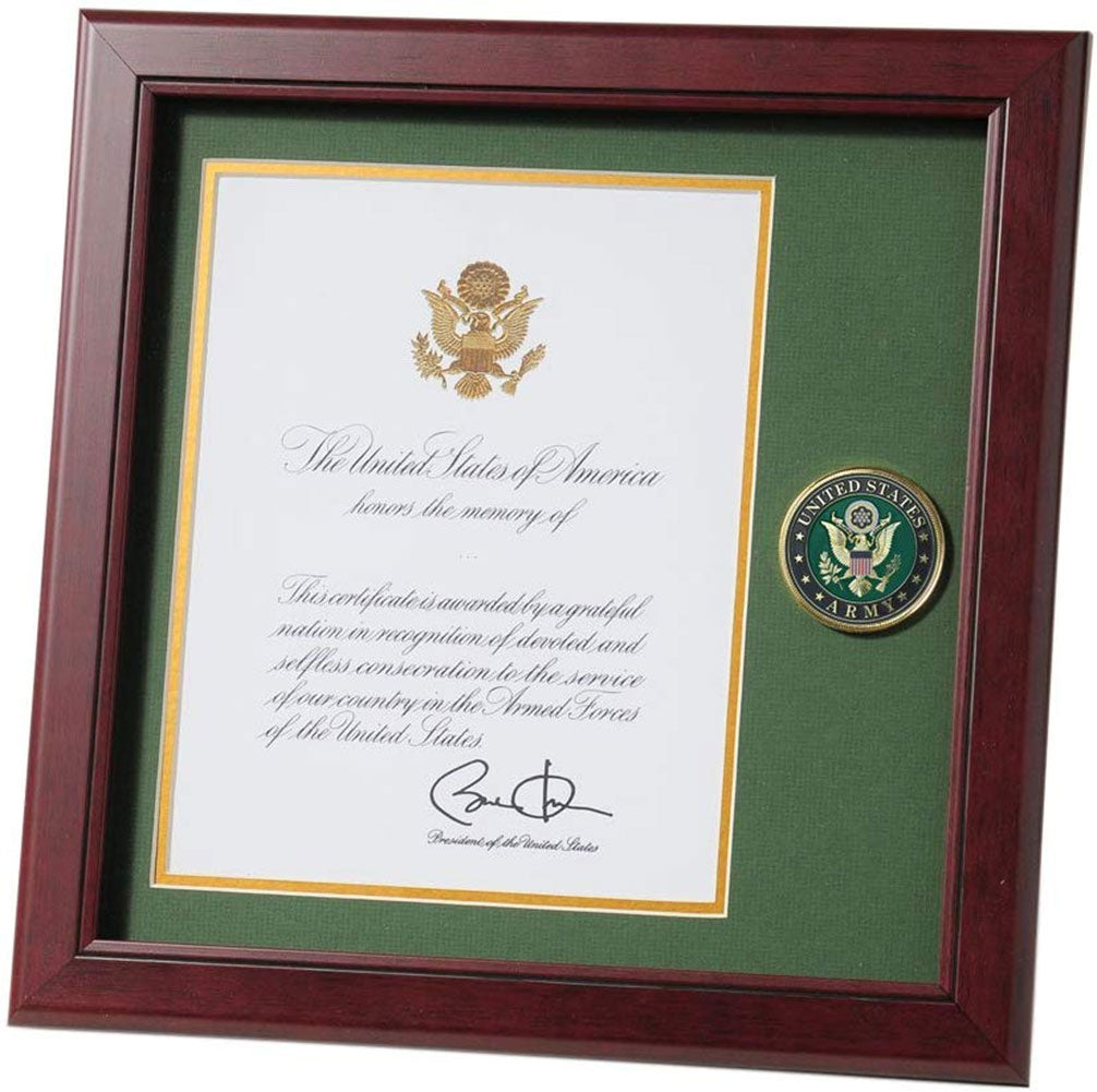 These testimonials highlight the elegance, craftsmanship, and respect embodied by the Army Presidential Memorial Certificate Frame with Medallion. It’s the ideal choice for displaying an 8 x 10-inch certificate with dignity and pride. (SEO Keywords: Army memorial certificate frame, 8x10 certificate frame, Presidential Memorial Certificate, Army green matting, mahogany frame with medallion)