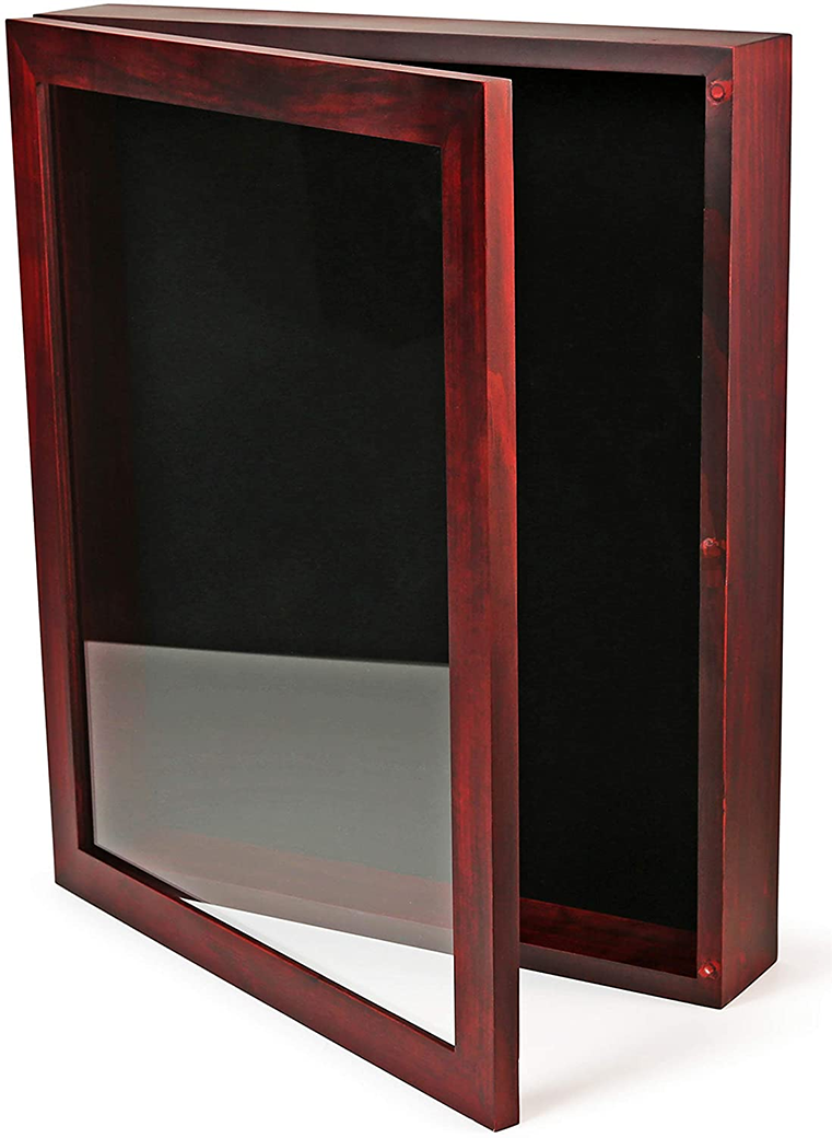 Make your memories last a lifetime. Proudly share with friends and family what’s important to you. This 12x15” OR 14 x 17 shadow box is large enough for jerseys, dresses, and military uniforms. And it’s black linen interior and cherry red frame draw attention and highlight your medals, pictures, and tickets. The New Zealand Pinewood frame is durable and built to last. While the glass display lets you clearly see your memories from any distance (unlike plexiglass other shadow boxes have). Take out your memorabilia to show others with the hidden magnets for easy closing and opening. And display your memories however you like. Whether it’s standing on a desk or hanging sideways/straight with the 4 saw tooth hooks.