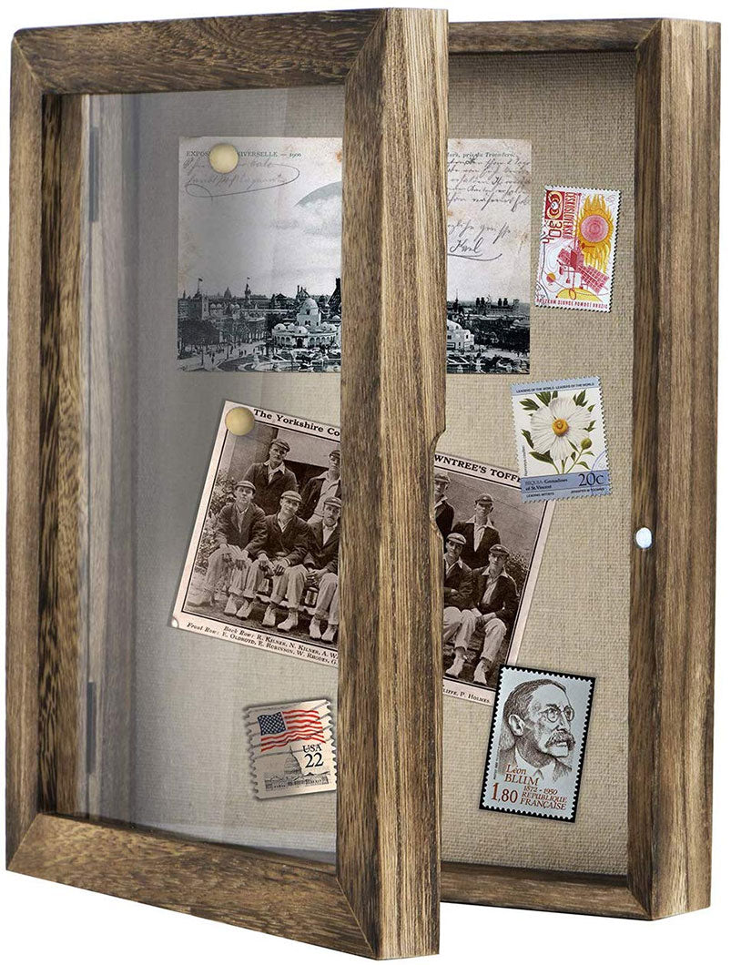 Shadow box with solid wood frame, woven fabric interior with 4 stick pins, magnetic door with a polished glass window that will perfectly protect your display of memorabilia. Inside the frame is a linen cloth with pins so you can arrange a personalized collage with photos, cards, concert tickets, medals, dried flower and handicrafts, etc. Prefect way to share your most cherished moments and memorabilia. The magnetic door design is very convenient to open and close, allowing you easily update your display as often as you want. Torched wood finish gives the shadow box a rustic/vintage look, great match or addition to any home decor. This pretty shadow box can stand on it's own on a tabletop, and has 2 sawtooth hanging hooks on this black for easy wall mounting. No assembly required.